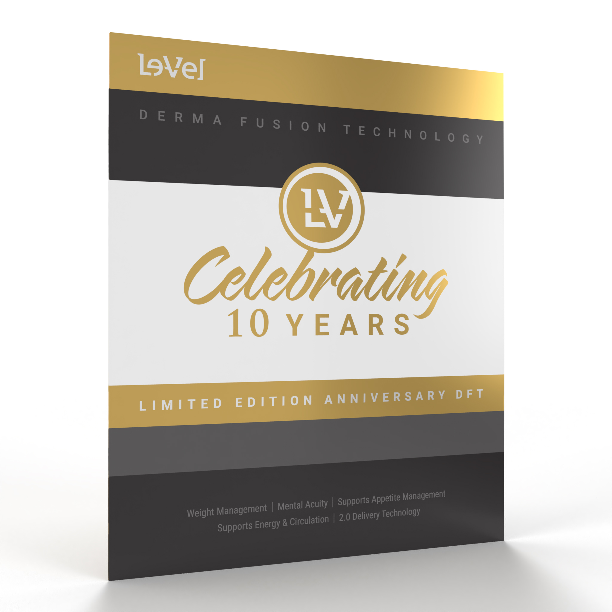 Le-Vel’s 10 Year Anniversary is here and we’re celebrating with a brand new innovation in Derma Fusion Technology. 10 YEAR ANNIVERSARY DFT is our largest surface size ever used in a single DFT application. We took our 10 years of experience and hundreds of millions of DFTs sold, to create a formula that combines the largest amount of ingredients possible, pulling features from our best-selling line of Standard, Ultra and Black Label into this Limited Edition 10 Year Anniversary DFT. Take your THRIVE Experience to the next level by using 10 Year Anniversary DFT as your 3rd Step.